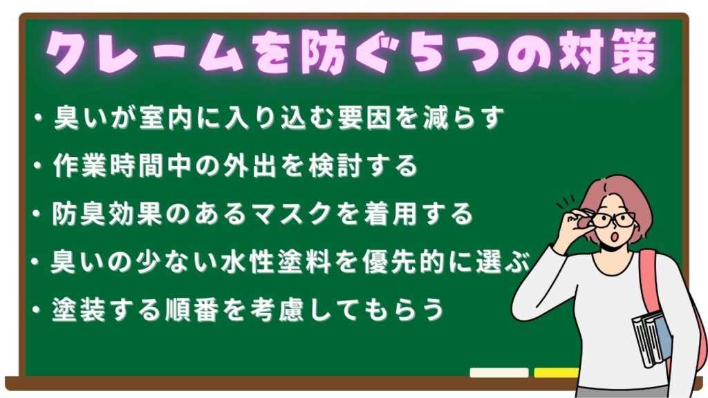 クレームを避けるために、塗装する順番を業者に相談してみるのも一つの対策です。例えば、「最初は片面だけ塗り、他の面は後日にする」といった工夫をしてもらうことで、既に塗装が終わっている側の窓は開けても臭いが気にならない可能性が高くなります。これにより、入居者様は完全に窓を閉め切る必要がなくなり不便を軽減できます。