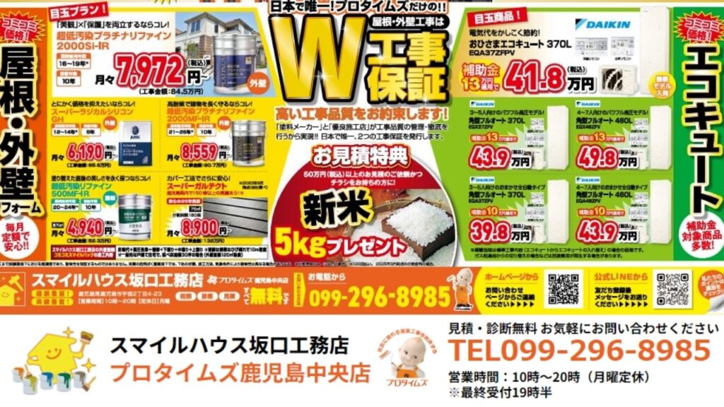 今回のお役立ちコラムでは、塗装の時期を逃さないためとスマイルハウス坂口工務店「定番チラシ」となぜ今が塗り替えのチャンスなのか?鹿児島市における塗装の重要性と鹿児島市の外壁塗装費用相場とキャンペーンを最大限に活用し、費用を賢く抑える秘訣とスマイルハウス坂口工務店の安心の3大宣言について詳しく解説します。
