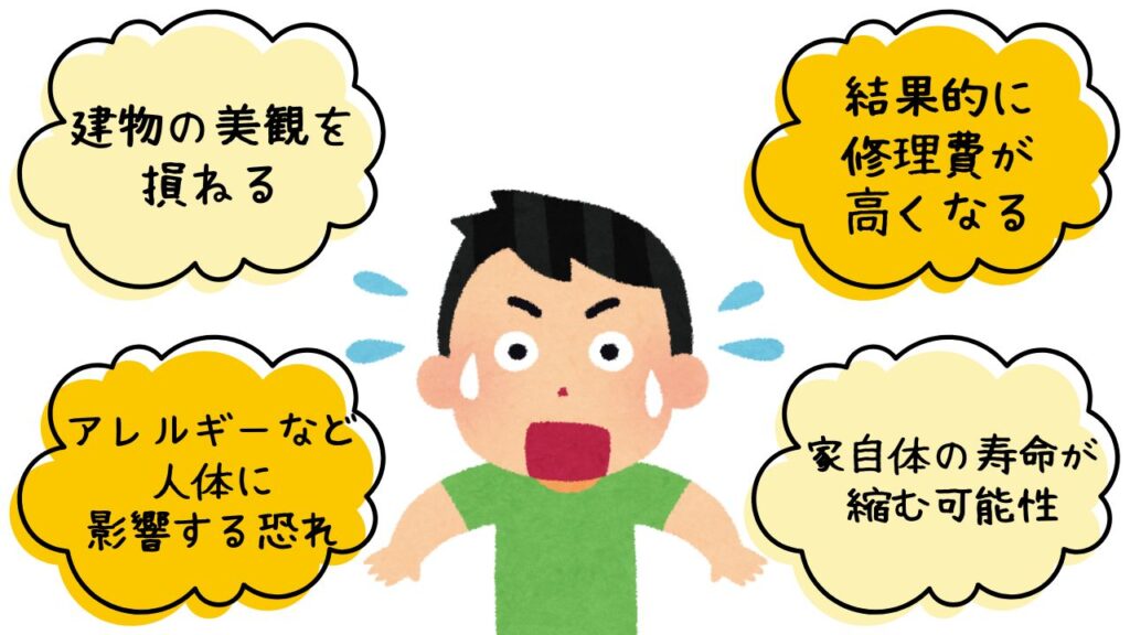 壁に劣化のサインを見つけた場合、見た目の悪さだけでなく放置していると家全体の寿命が短くなります。放置してはいけない4つの理由についてそれぞれ詳しくご紹介させていただきます。
