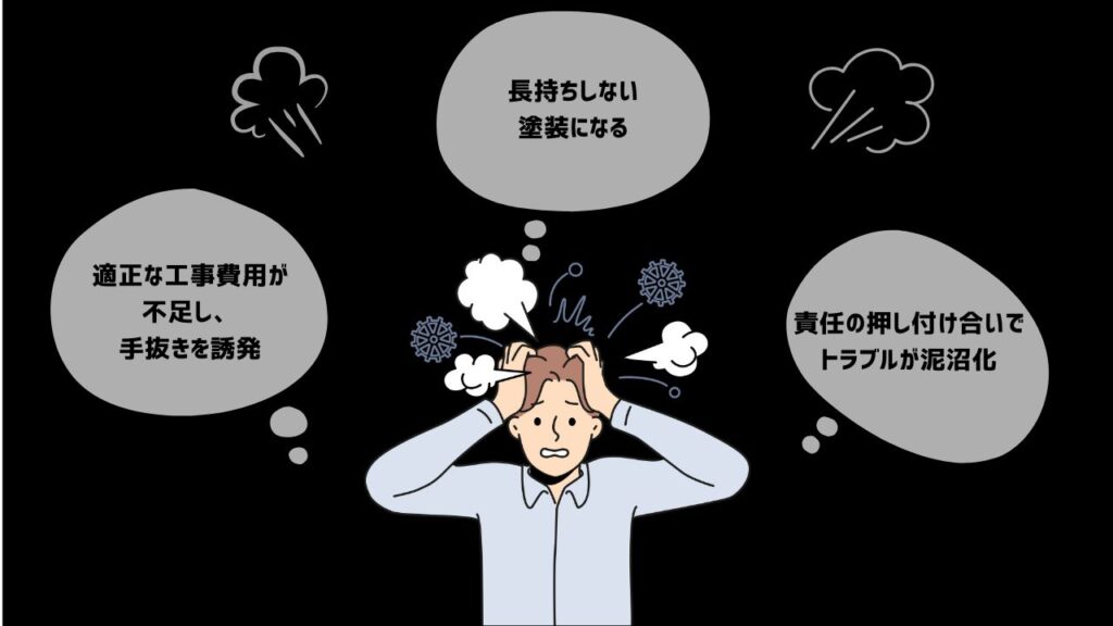 あなたが期待していた費用分の耐久度(長持ち)を実現できず、数年で再塗装が必要になるなどトータルコストが大幅に上がってしまいます。