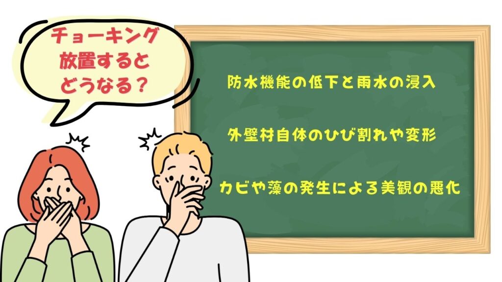 水分を吸った外壁材は、劣化が加速しもろくなります。またチョーキング段階で塗装を行えば安く済みますが、外壁材自体の交換が必要になると費用が数倍〜数十倍に膨れ上がってしまいます。