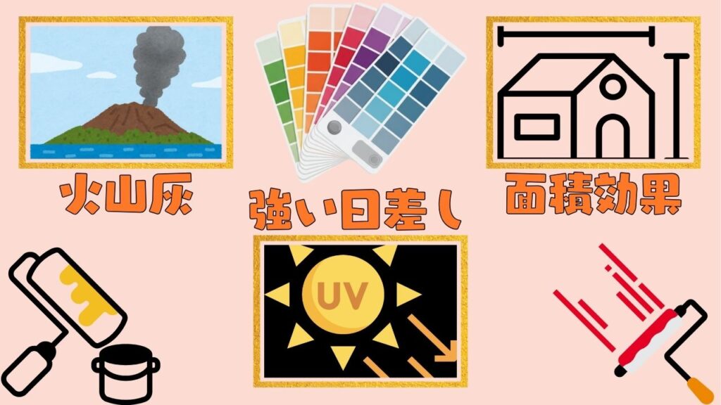 桜島の降灰が多い地域では、真っ黒や真っ白といった単色は火山灰の色が目立ちやすいです。「グレー系」「茶系」といった中間色を選ぶ事で付着した汚れが目立ちにくく、美観を長く保ちやすくなります。