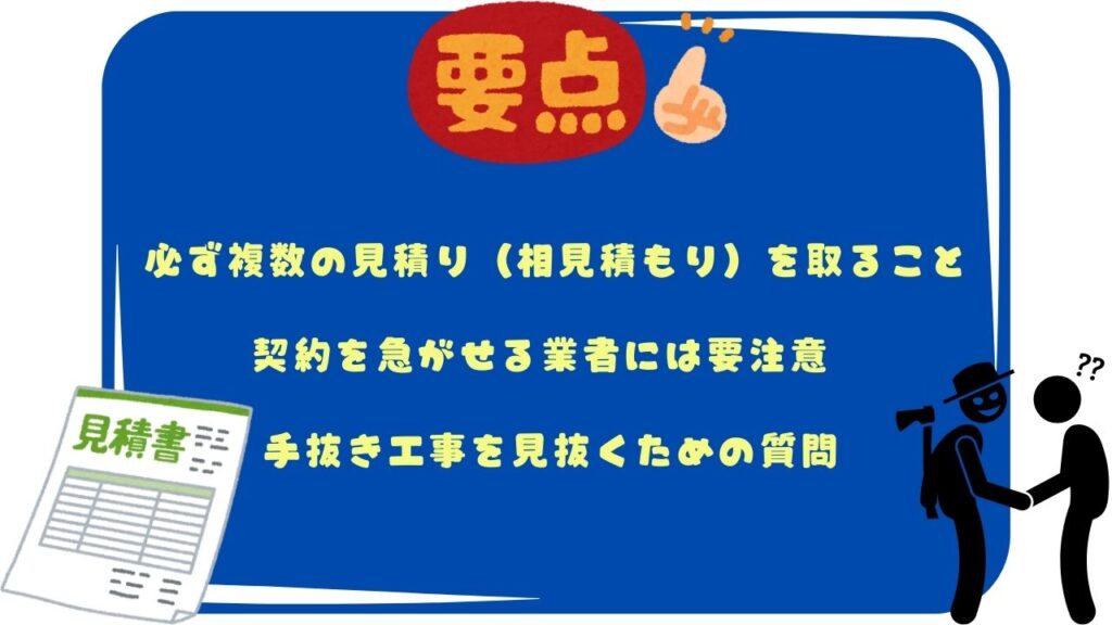 悪徳業者を避ける最も確実な方法は、3~4件の相見積もりを必ず取ることです。複数の業者から見積もりを取ることで料金の相場を把握でき、不当に高すぎる業者や逆に安すぎる(手抜きのリスクがある)業者を見分けられます。