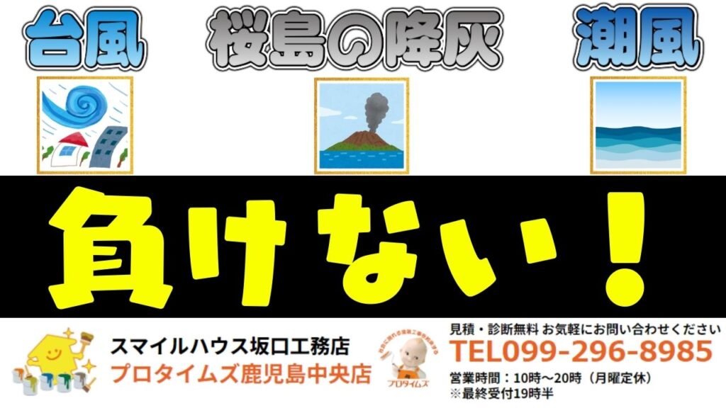 塗装の時期を間違ってしまうとそれぞれの塗料の性能が十分に発揮されず、工事期間が長引いてしまう可能性があります。さらに私たち鹿児島市に住む人にとって、外壁塗装や屋根塗装は「桜島の降灰」や「海の潮風」そして「台風」といった、他県にはない厳しい自然環境への対策が必須です。