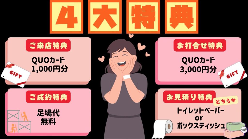 期間中当店のショールームに初めてご来店いただいたお客様全員に、QUOカード1,000円分を差し上げます! 外壁塗装のカタログを見たり、最新の塗料の質感を確かめたりするついでにゲットしちゃってくださいね。