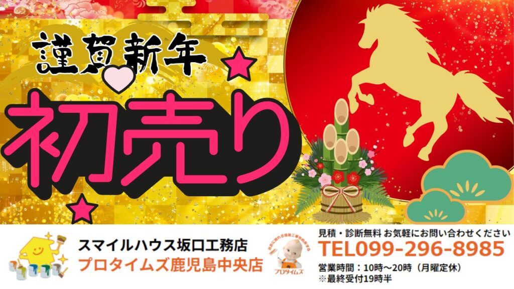 今回のお役立ちコラムでは、2026年のスタートを「お家のメンテナンス」からと令和8年にちなんだ「新春初売り塗装キャンペーン」の概要と絶対に見逃せない!豪華4大特典を詳しく解説となぜ外壁塗装で「足場代無料」が一番お得なのと鹿児島市の1月・2月は塗装に適しているとスマイルハウス坂口工務店が選ばれる理由について詳しく解説します。