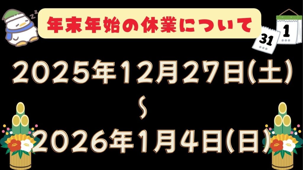 誠に勝手ながら、2025年12月27日(土)〜2026年1月4日(日)の間は年末年始休業とさせていただきます。