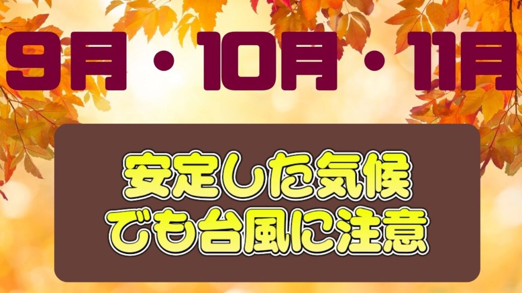 秋(9月・10月・11月):安定した気候、でも台風に注意