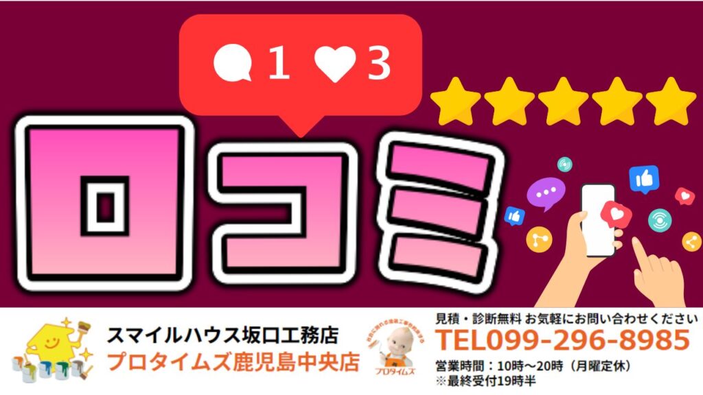 今回のお役立ちコラムでは、外壁塗装の業者選びで「口コミ」が重要な理由と口コミは「お客様の生の声」:ネット時代の賢い情報収集と高評価な外壁塗装業者が持つ「5つの特徴」と 口コミが良い業者 vs 注意が必要な業者の見分け方と鹿児島市特有の悩み:火山灰対策も口コミでチェックとスマイルハウス坂口工務店が口コミで選ばれる理由について詳しく解説します。