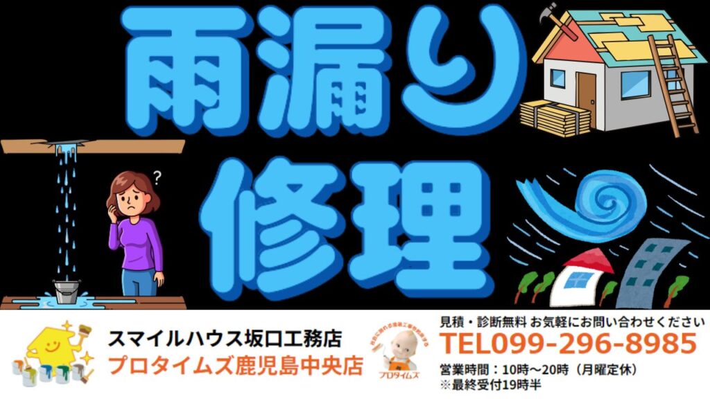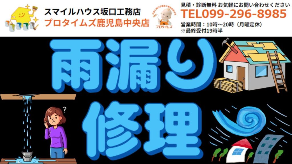 今回のお役立ちコラムでは、雨漏りはスピード勝負!放置するリスクとはと雨漏り修理の費用相場一覧表と修理費用の決まり方:小規模修理から大規模修理までと場所ごとの症状と具体的な修理内容と鹿児島市での業者選び:失敗しないための4つのポイントと知らなきゃ損!火災保険で雨漏り修理ができるかもと火災保険申請の5ステップについて詳しく解説します。