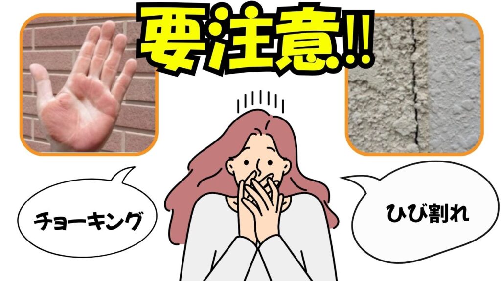 外壁を指でスッと撫でた時、白っぽいチョークのような粉がつく状態のことです。 これは塗料の中にある樹脂が紫外線などで分解され、色の成分(顔料)が表面に出てきてしまっている証拠。「塗装の防水機能が切れてきていますよ」というお家からのサインです。