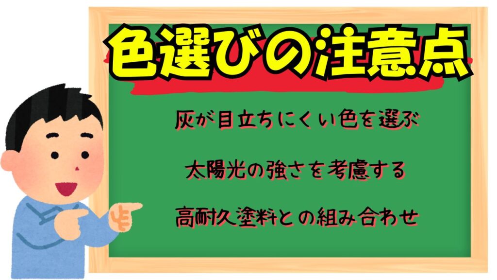 灰は酸性なので、放っておくと塗膜を傷めます。色だけでなく、灰を洗い流しやすい「低汚染機能」がついた塗料をシミュレーションの段階から選んでおくことが大切です。