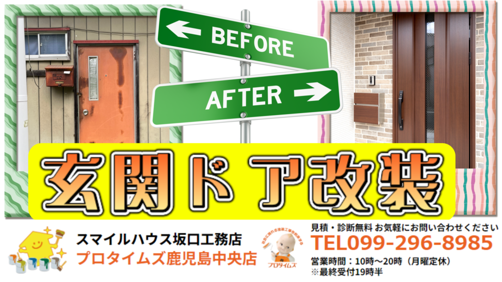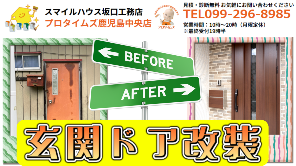 今回のお役立ちコラムでは、外壁塗装をすると玄関の「古さ」が目立つと玄関ドアは「塗装」ができないって本当?その理由と最新リフォームの主流!「カバー工法」のメリットと仕組みと玄関ドアの「塗装」と「交換(リフォーム)」の違いと鹿児島市だからこそこだわりたい!玄関ドア選びのポイントと開き戸から引き戸へ!使い勝手を劇的に変えるリフォームと気になる費用と工期についてとスマイルハウス坂口工務店が三協アルミと提携した理由とワンストップで解決!外壁塗装とドアリフォームをセットでするメリットについて詳しく解説します。