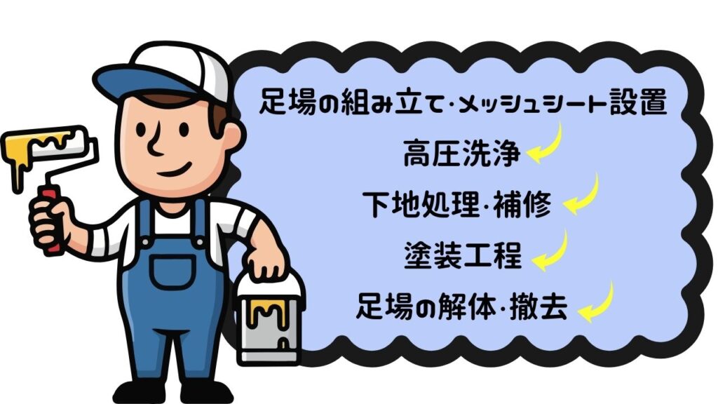 足場がないと、職人さんは自分の身を守ることに意識がいってしまい、肝心の「塗る作業」に集中できなくなります。不安定な姿勢では、どうしても塗りムラや塗り残しが出てしまい、施工品質が落ちてしまいます。高品質な仕上がりのためには安定した足場が絶対に必要なんです。
