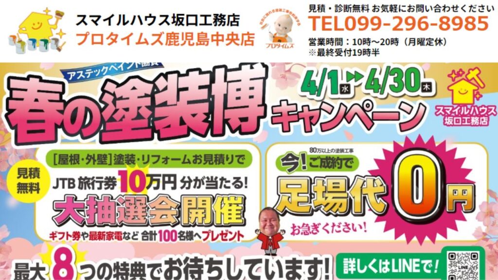 2026年4月の「春の塗装博キャンペーン」は、足場代無料をはじめとしたお得な1ヶ月間です。「まずは話を聞いてみたい」 「うちの壁の状態を診てほしい」 「どのくらい安くなるのか計算して!」そんな方は、ぜひ今すぐスマイルハウス坂口工務店へお問い合わせください。 人気の足場無料特典などは枠に限りがある場合もございますので、早めのご予約が安心です。