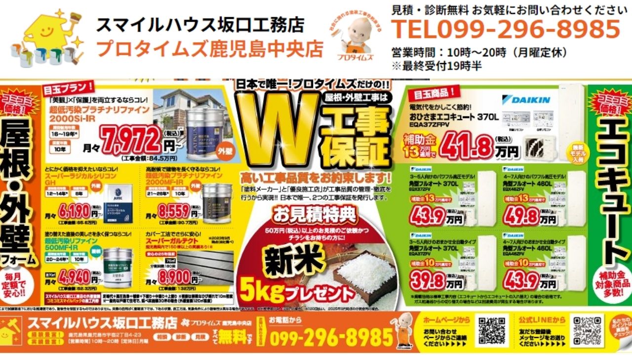 【鹿児島市】家のおしゃれは外壁から!外壁塗装チラシ活用法 2025年11月03日(月) 鹿児島市で屋根塗装・外壁塗装、屋根葺き替え工事でお悩みの方は スマイルハウス坂口工務店・プロタイムズ鹿児島中央店まで! みなさんこんにちは!事務の拵です! 「家を建ててから約10年経っているけど、そろ・・・