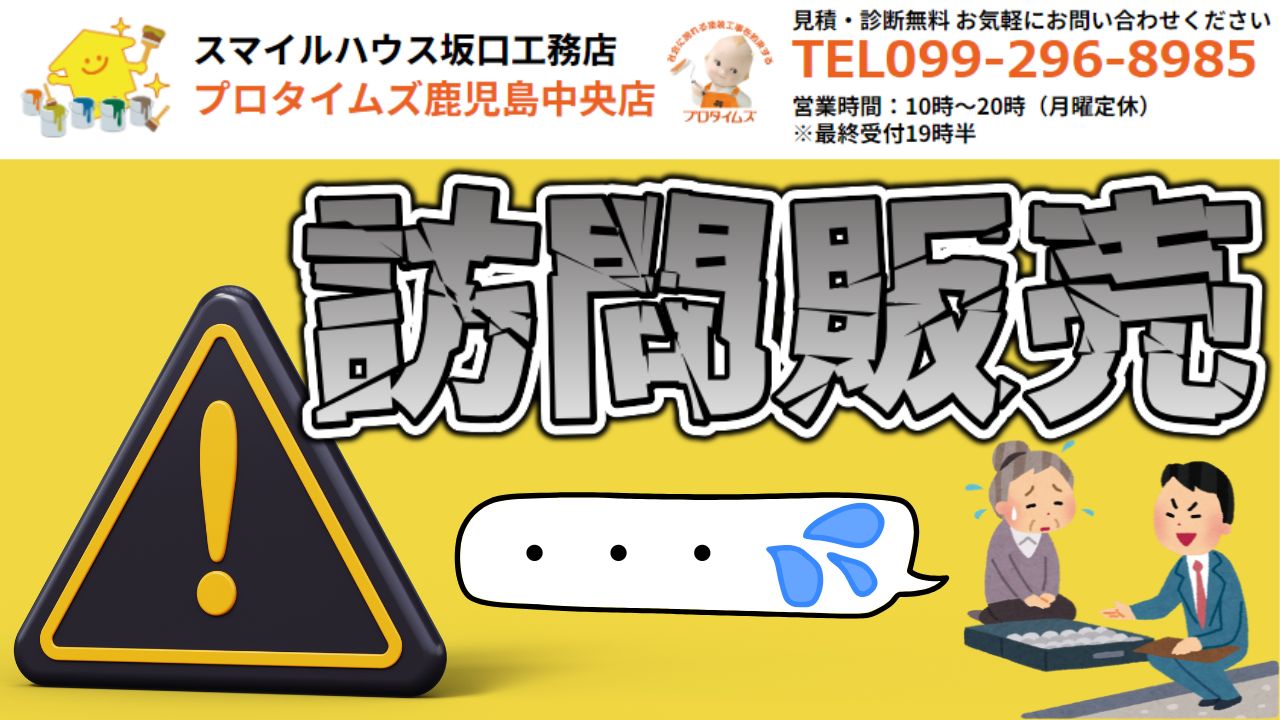 【鹿児島市】「外壁塗装の訪問販売」は信用できる?悪質業者の巧妙な手口 2025年10月09日(木) 鹿児島市で屋根塗装・外壁塗装、屋根葺き替え工事でお悩みの方は スマイルハウス坂口工務店・プロタイムズ鹿児島中央店まで! みなさんこんにちは!事務の拵です! 「突然、『お宅の屋根がずれているのが見えまし・・・